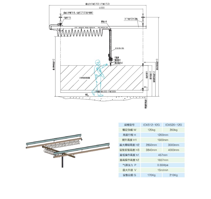 ICXS12-12G,桁架式安装,负载120KG,用户可根据现场实际情况,自行设计制造辅助吊架,配合SADE的 I 型主机,完成各种工况的搬运。详细资料可向就近办事处工程师索取。